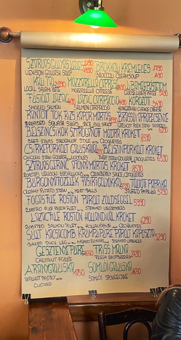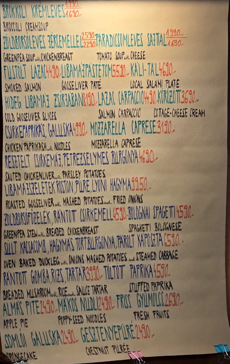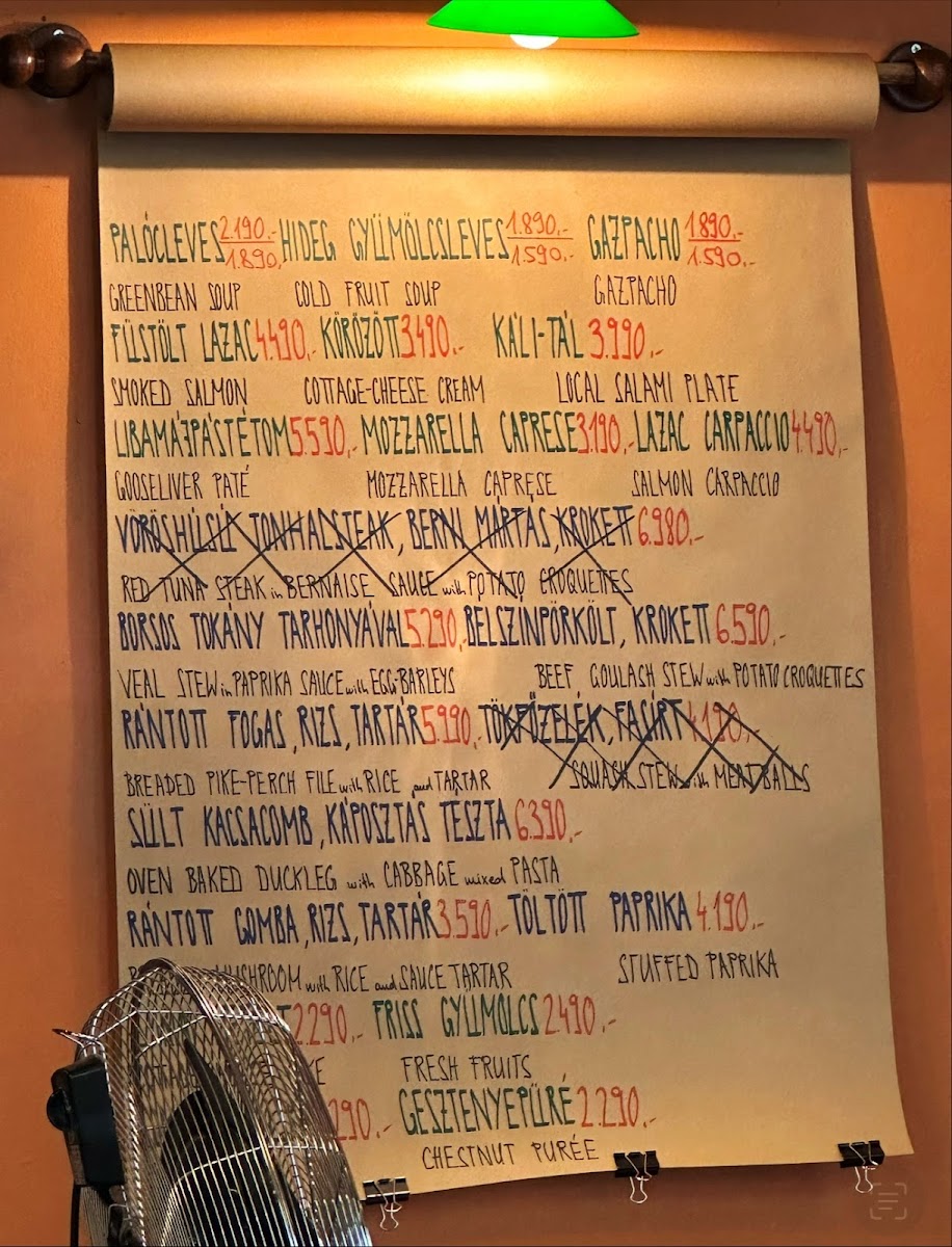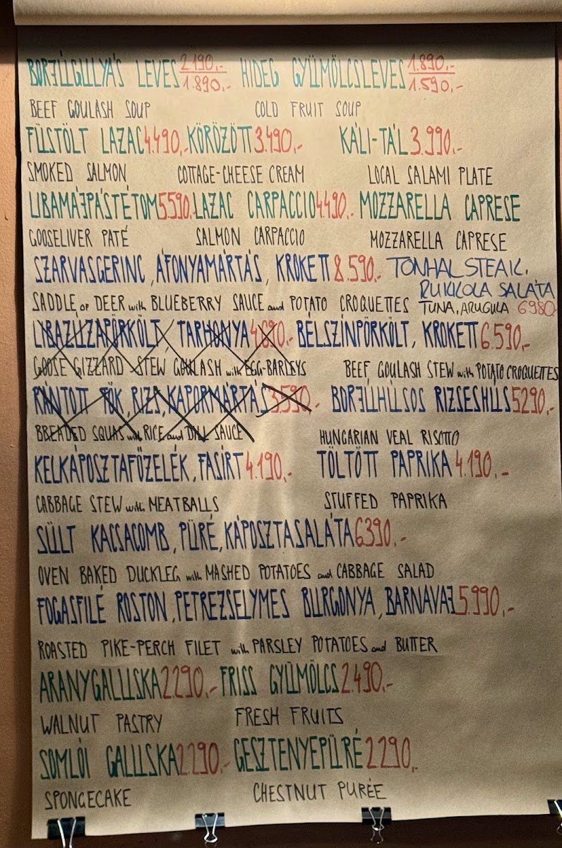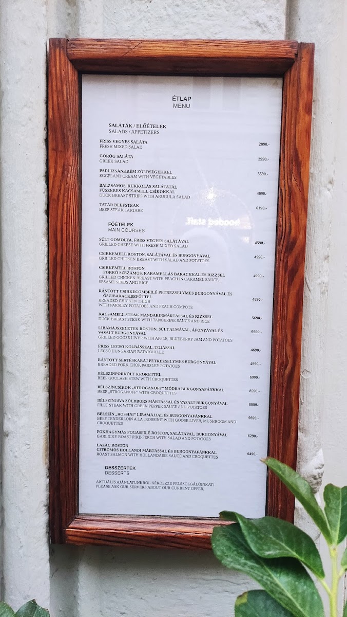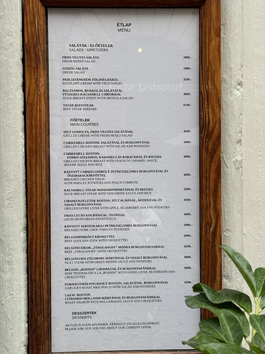 On the menu, you’ll find hearty options like Beef Tenderloin Goulash Stew served with crisp potato croquettes or a richly flavored Oven Baked Duck Leg. Lighter starters such as Salmon Carpaccio and a refreshing Hungarian Cold Plate provide a pleasant contrast, while sweet endings like Somlói Spongecake in chocolate sauce or Apple Strudel offer gentle, familiar finishes. A well-considered range of soups, including Vegetable Soup, and savory mains like Duck Breast Steak with Tangerine Sauce invite diners to enjoy meals that feel both satisfying and seasonal.
